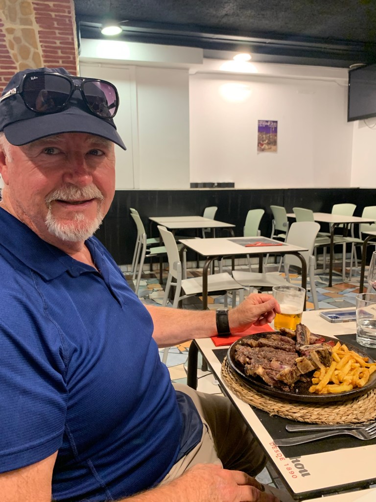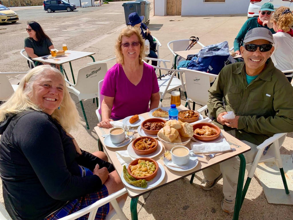 We found our way to a Cafe-Restaurant in Villafranca Montes de Oca. There were lots of Pilgrims sitting around and being our breakfast was pretty lackluster, I felt it was time to fuel up for our climb. I saw these red bowls that were filled with warm food. That’s what I want. I asked George what he desired and he asked me to pick something out. Wow, this is the new and improved version of George. I went inside and saw many types of food from meats, vegetables and tartas. I thought I was ordering a little of each, but to my surprise I was getting a bowl of each item. I walked out with Meat, Chicken, Mushrooms, Cauliflower and Broccoli Mixture and One Big Ortega Chile. It was a feast like nothing we have had for lunch. Everything was incredibly tasty and the meat and chicken fell off the bone. It was our best meal on trail to date. No doubt!