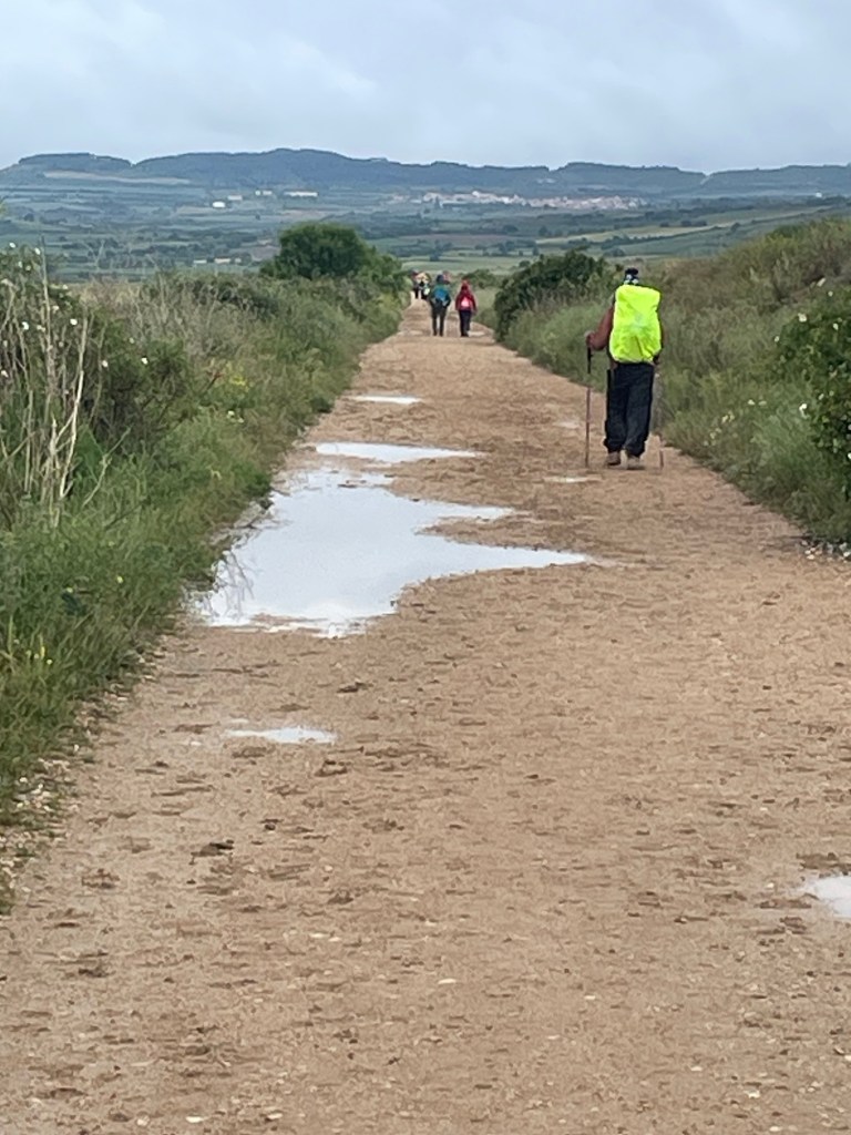 We walked on top of a plateau for quite sometime and finally started dropping. The rain was off and on but nothing too crazy. We stopped in San Juan de Ortega for a rest. The boys and I had Beer and Mel was the Sober Walker. She had her Coke and us girls took our feet out of bondage! As soon as we were considering our exit plan, it started raining. But this was real rain. Put on your Packcover, Rain Jacket, get the umbrella ready and get ready.