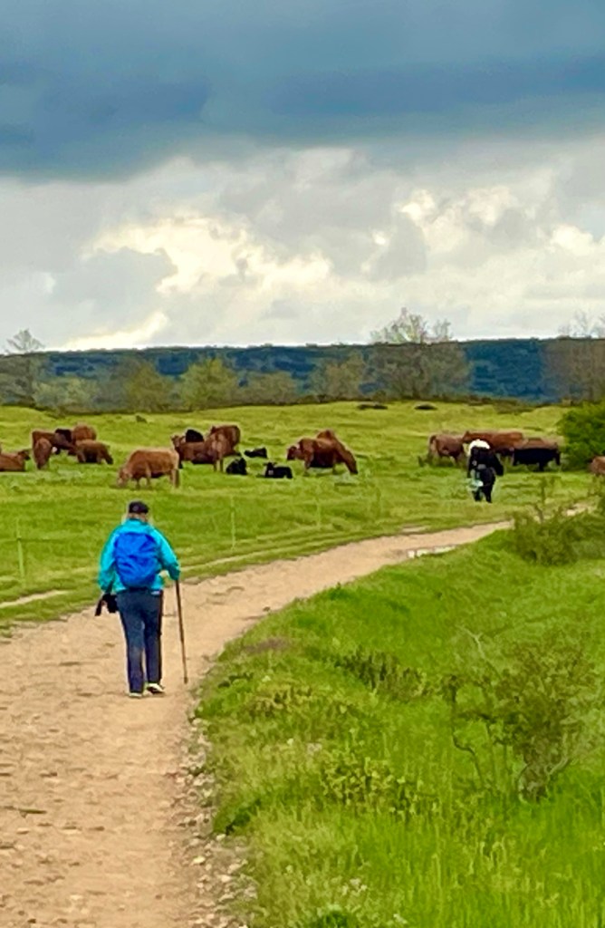 The last five miles were wet. We had a field of Cattle Crossings and then the big cows. I hadn’t seen livestock since I left France, which was quite awhile ago. They were minding their own business, on their side of the wired fence so no need to be concerned. Cows don’t bother me and I enjoy seeing them. What I have learned is to not drink the water where they reside.