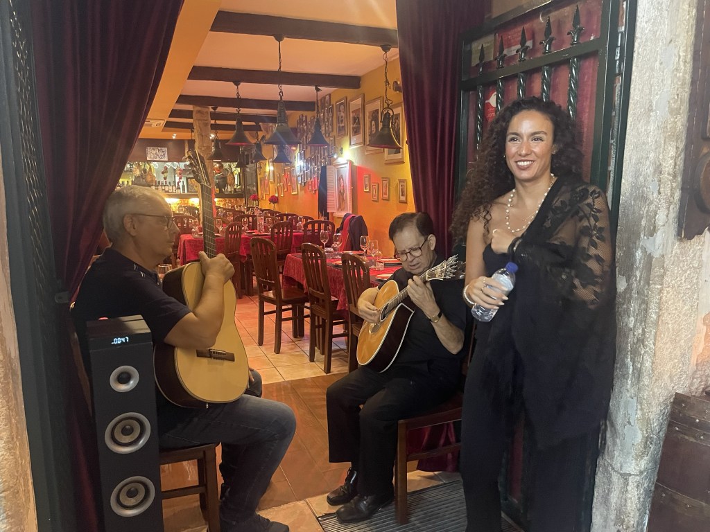 This is the first Pilgrim Meal I have seen on a menu. For $15 Euros you get bread, olives, carafe of wine, soup and salad, choice of fish or meat, vegetables, followed up with dessert and espresso. George decides he’ll go straight to the dessert and gets a banana split. We share dinner. It’s all we can eat.