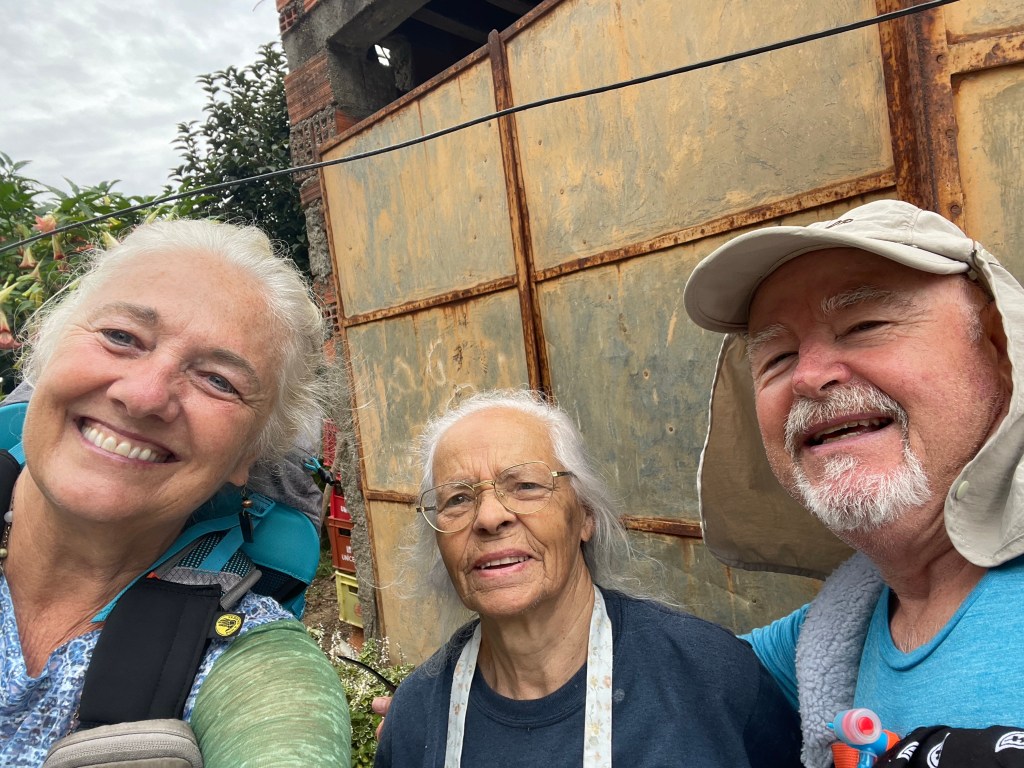 The rest of the afternoon is easy going, heading down into our resting place for the night. We end up walking the road and meet another Portuguese Lady who is 87 years old. She is about 5’ tall if even that and the funniest I have met. She is warning us of each car that is coming up the road and I’m getting her to walk with us to Santiago. She doesn’t speak English and I’m not fluent in Portuguese but we are having a long conversation that we both seem to understand. What a hoot she is!